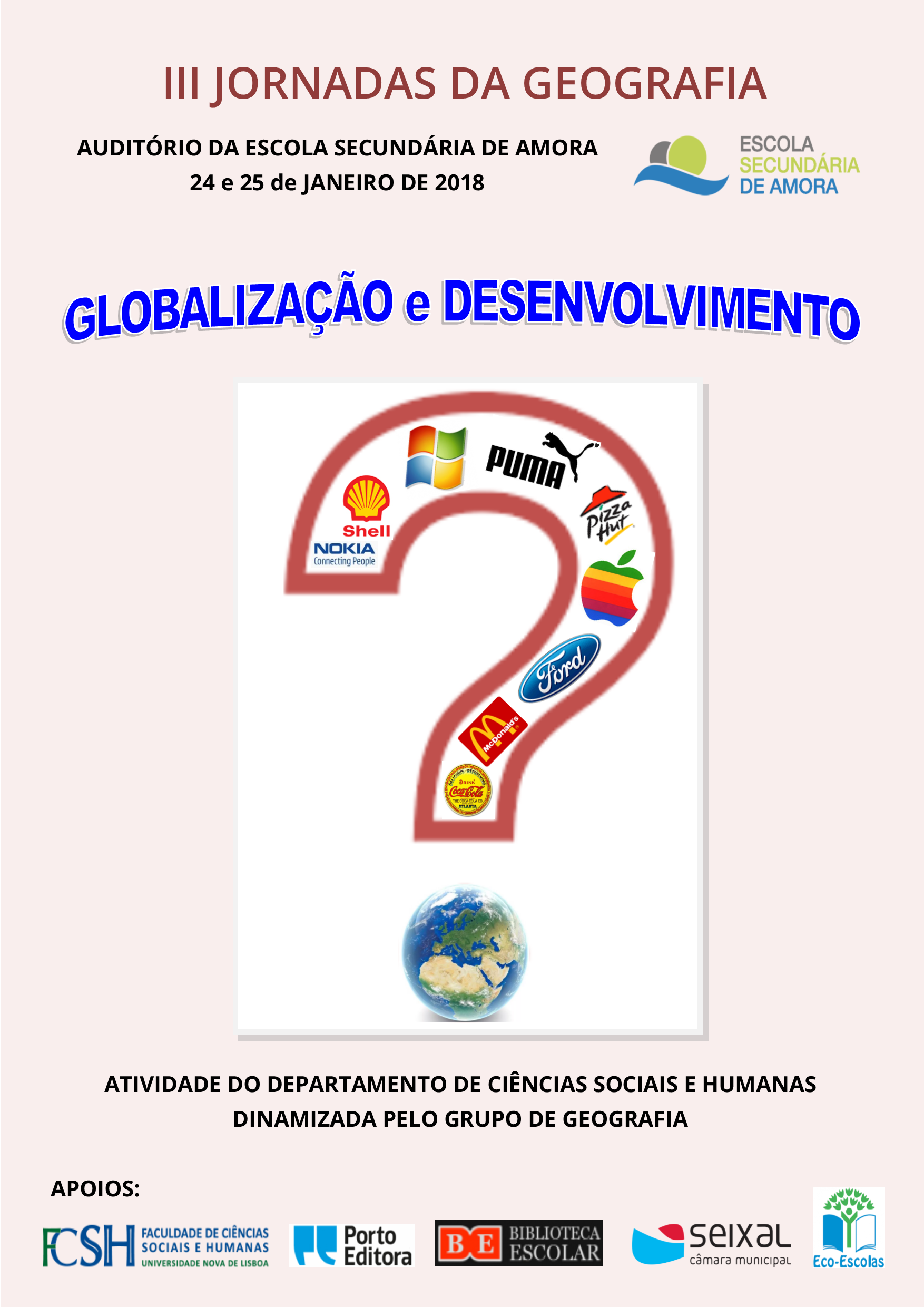 Vão decorrer nos dias 24 e 25 de janeiro de 2018 as III Jornadas da Geografia, evento relevante para a comunidade escolar da ESA, mas também para o grupo de geografia de outras escolas do Seixal, onde se propõe a análise, reflexão e debate, por parte da comunidade educativa, de um conjunto de conexões existentes entre as questões ambientais, como o clima e os oceanos, e a evolução das sociedades, fruto da globalização.