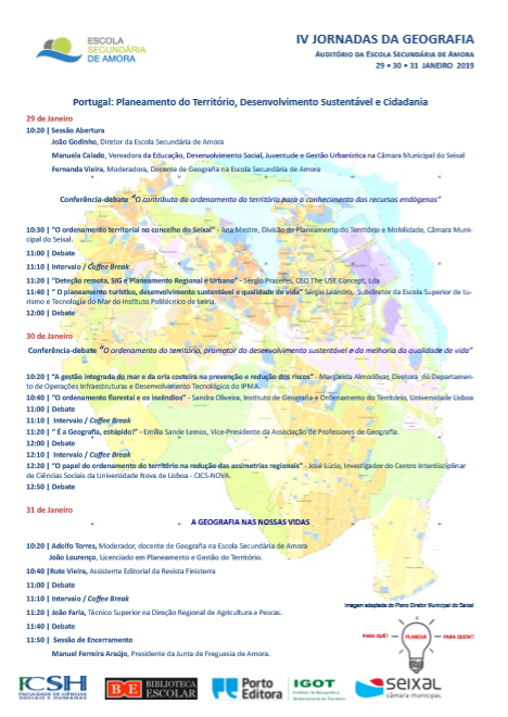 “Portugal: Planeamento do Território, Desenvolvimento Sustentável e Cidadania” é a temática escolhida para estas IV Jornadas da Geografia que decorrem nos dias 29, 30 e 31 de janeiro de 2019. Esta temática pretende despertar a consciência da comunidade escolar sobre os valores da paisagem, bem como contribuir para o reconhecimento e valorização dos recursos endógenos. Por outro lado, pretende relembrar que os cidadãos têm o direito de participar no processo de Ordenamento do Território através da formulação de sugestões e pedidos de esclarecimento e da intervenção na fase de discussão pública que precede a aprovação.